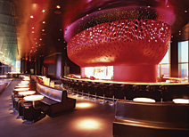 へ足を踏み入れると、壁一面真っ赤なレザーに小さなディスプレイが無数にあり、ステンレスのシルバーがバーカウンターをより一層シャープに引き立たせてい