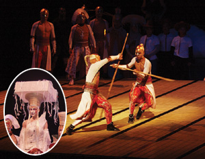 畳を舞台に見立てる発想がおもしろく、アジア色が濃く出ているシーンのひとつである。中国の武術である刀や剣を巧みに操り、そこにアクロバティック