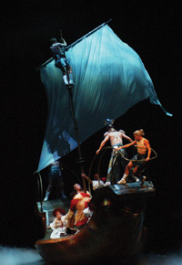 ある。その揺れに耐えられず人々が舟から投げ出されてしまう。パフォーマーは振り子のように揺れる舟の遠心力を利用して、オリンピック級の回転やひねりを